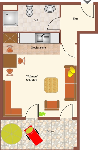 Die Wohnung besteht aus einem Wohn-/Schlafraum mit Zugang zum Süd-West-Balkon, Küchenzeile, Bad und Flur. Ein sonnenlichtdurchflutetes kleines Feriendomizil in idealer Lage.
