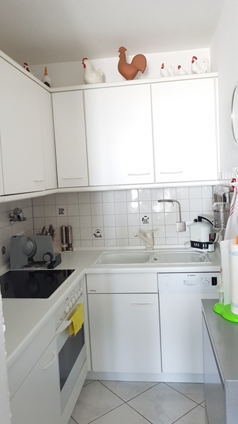 Das Badezimmer ist hell gefliest. Den großen Balkon betreten Sie über das Wohnzimmer und das Schlafzimmer. Eine komplett ausgestattete Küchennische wurde vom offenen Wohnbereich abgetrennt.